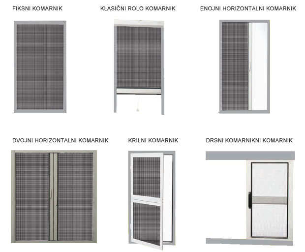 Vgradnja komarnikov je možna kot samostojni elementi na oknih ali skupaj z roletami. Komarniki so sestavljeni iz alu profilov ter mreže, ki je izdelana iz steklenih vlaken in je odporna na vremenske vplive. Izdelana je v sivi barvi in ima posebno UV zaščito. Možnost dobave komarnikov je v več barvah.